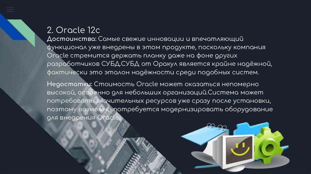 2. Oracle 12cДостоинства: Самые свежие инновации и впечатляющий