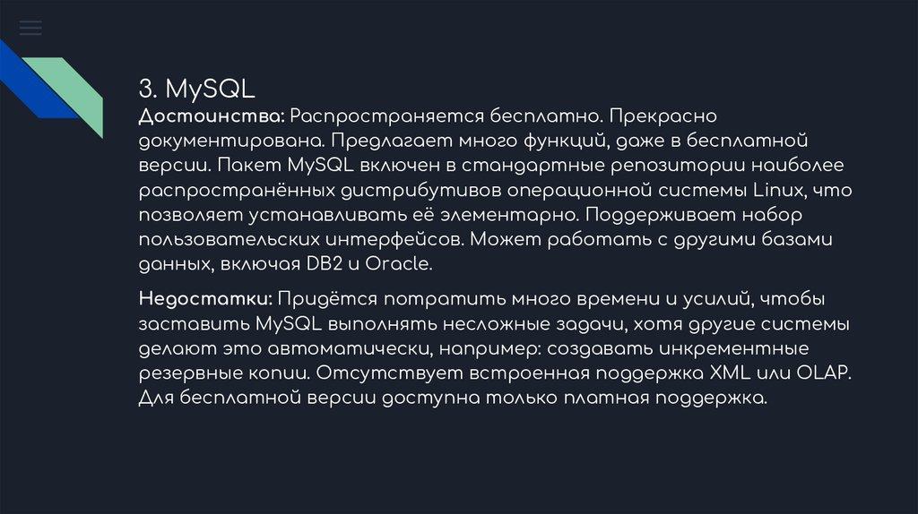 3. MySQLДостоинства: Распространяется бесплатно. Прекрасно