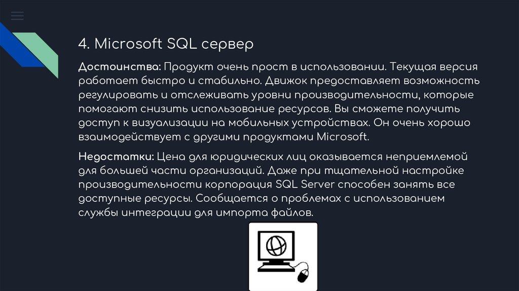 4. Microsoft SQL серверДостоинства: Продукт очень прост в использовании. Текущая версия