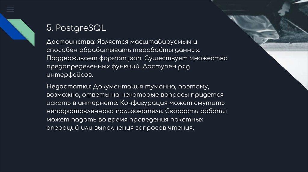 5. PostgreSQLДостоинства: Является масштабируемым и