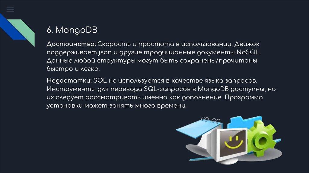 6. MongoDBДостоинства: Скорость и простота в использовании. Движок