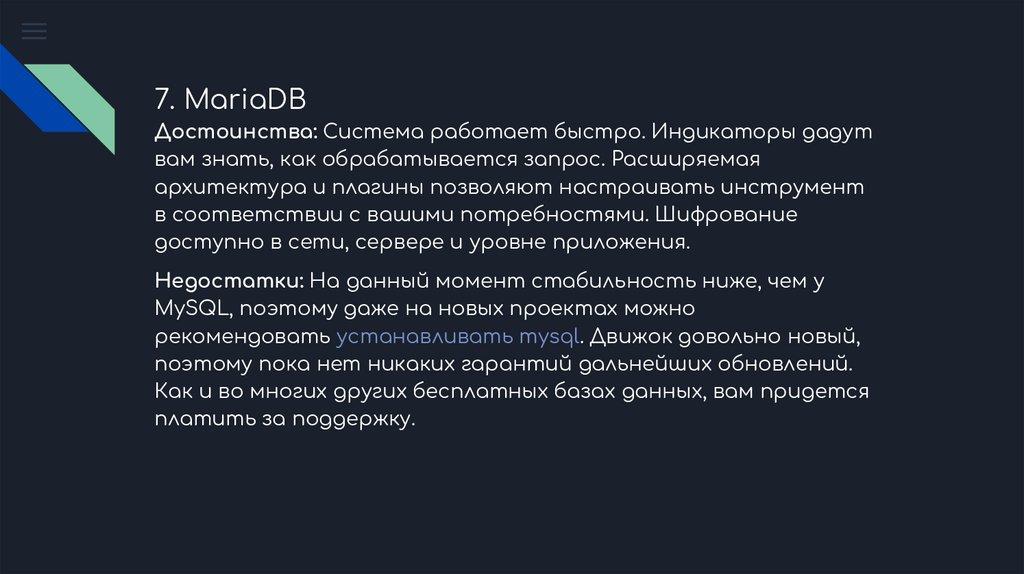7. MariaDBДостоинства: Система работает быстро. Индикаторы дадут