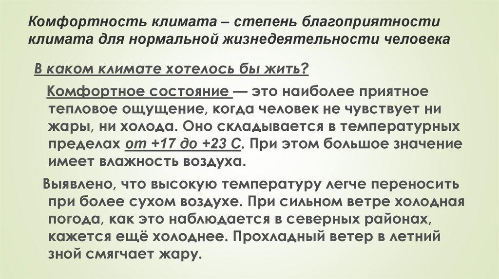 Комфортность климата – степень благоприятностиклимата для нормальной жизнедеятельности человека