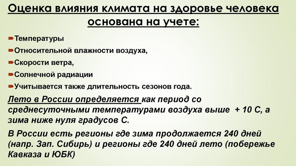 Оценка влияния климата на здоровье человекаоснована на учете: