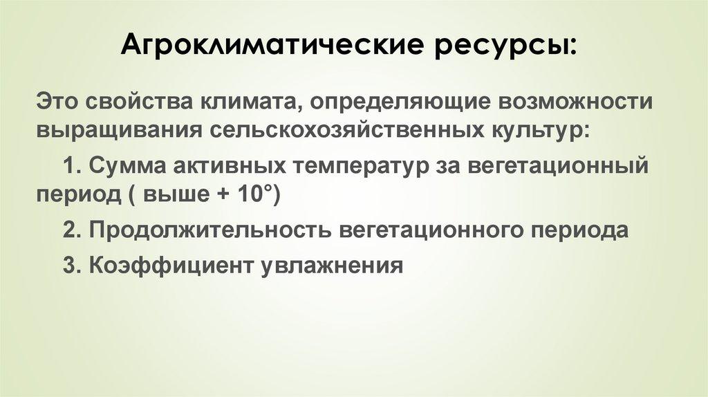 Агроклиматические ресурсы:Это свойства климата, определяющие возможности