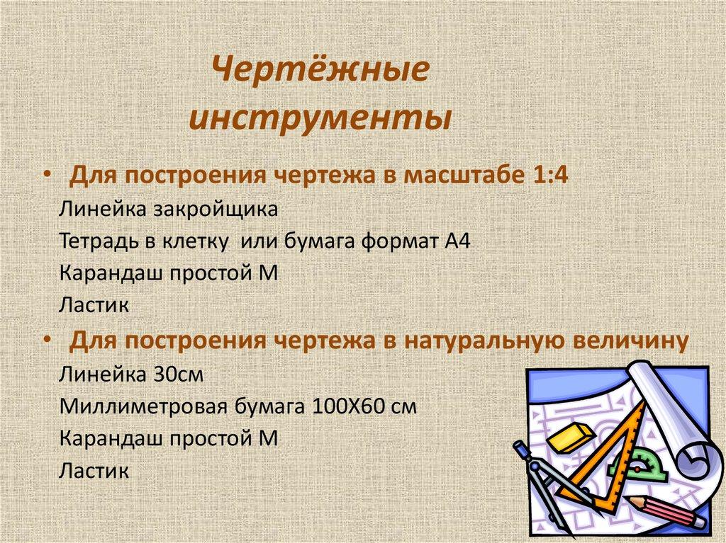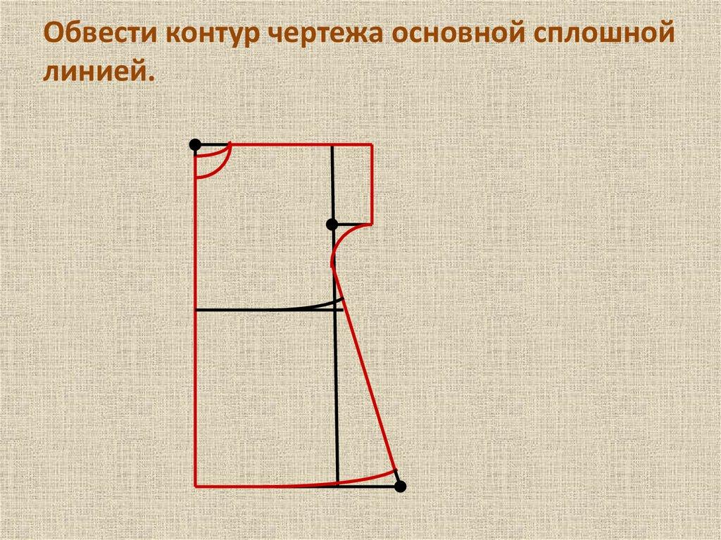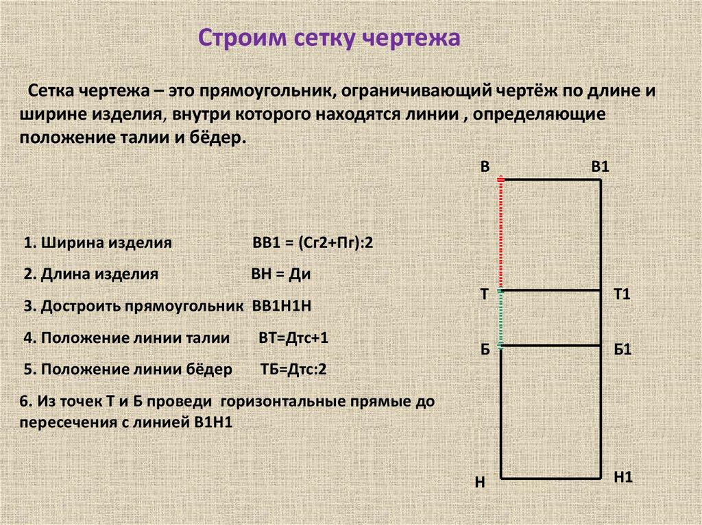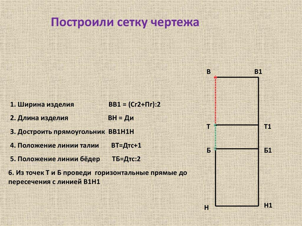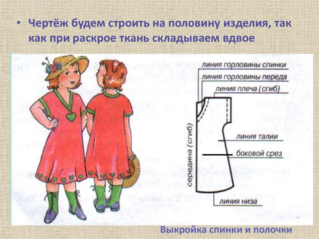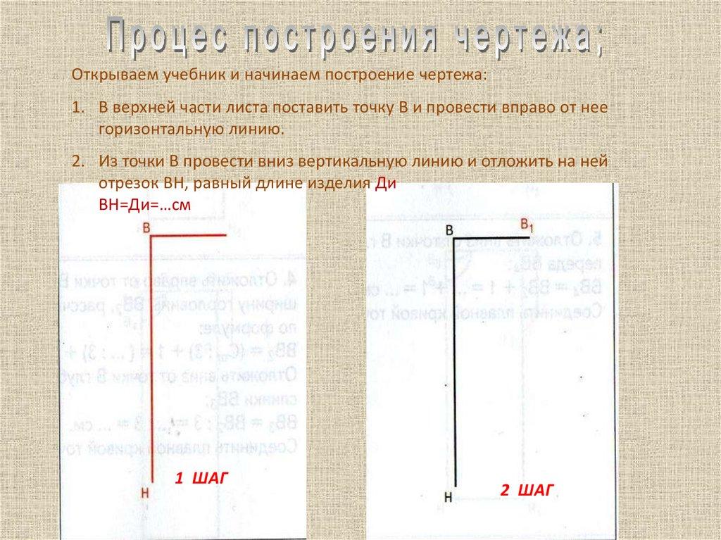 • Чертёж будем строить на половину изделия, таккак при раскрое ткань складываем вдвое