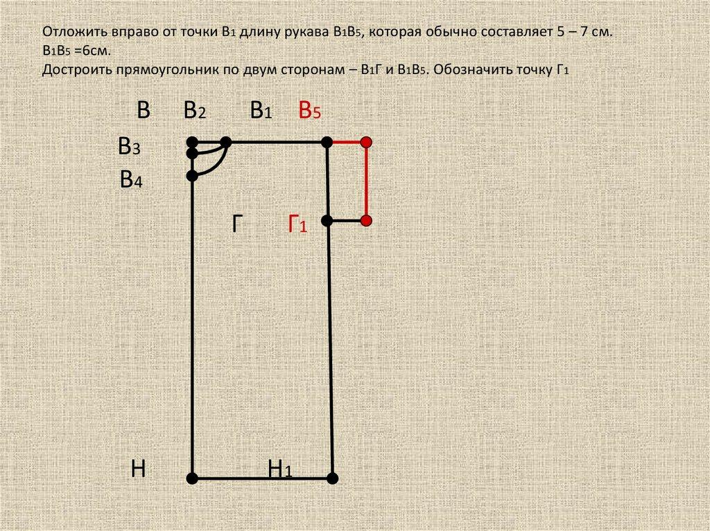 Отложить вправо от точки В1 длину рукава В1В5, которая обычно составляет 5 – 7 см.В1В5 =6см.