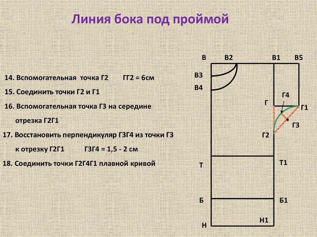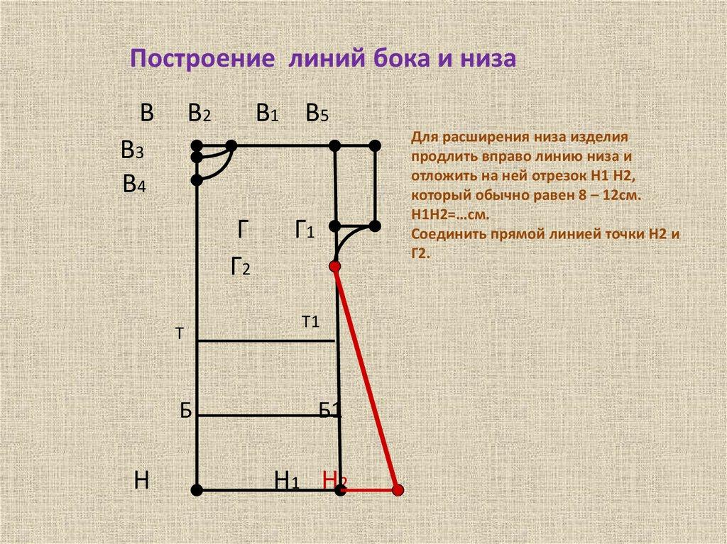 От точки В вправо по линии плечаотложить ширину изделия ВВ1,