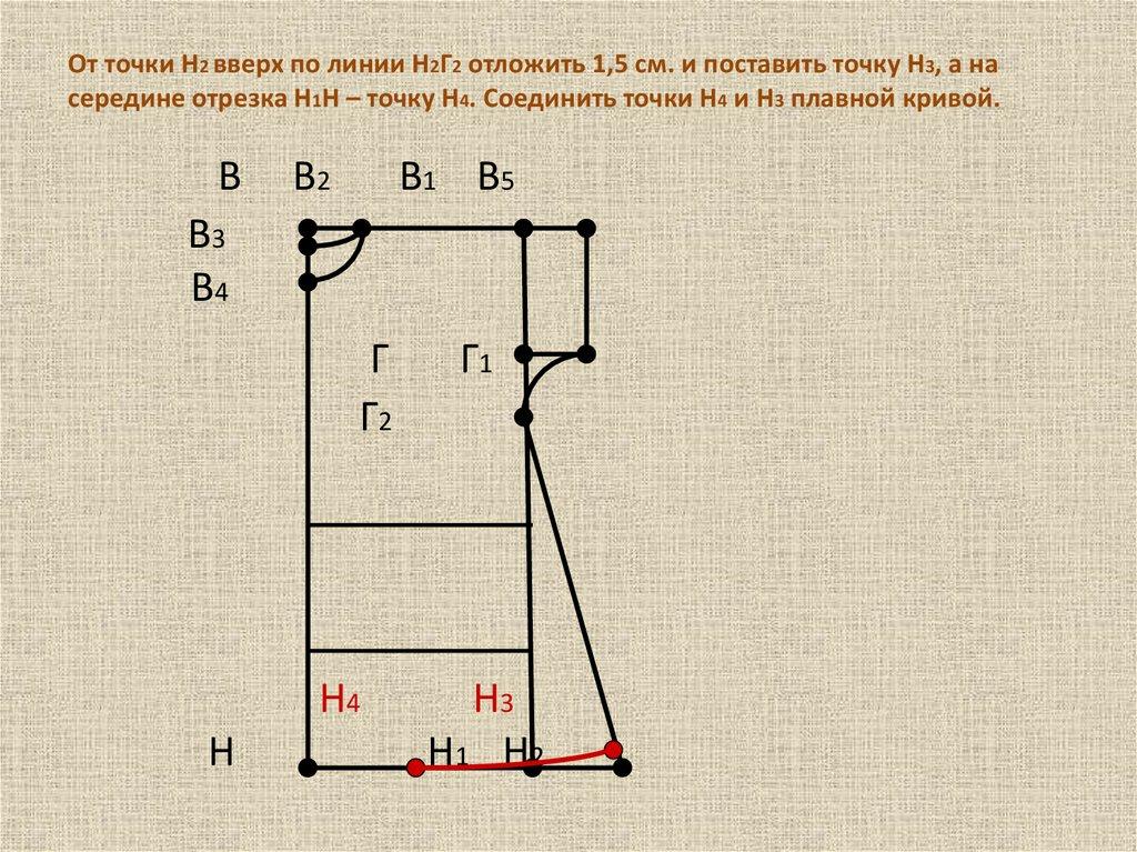 От точки Н2 вверх по линии Н2Г2 отложить 1,5 см. и поставить точку Н3, а насередине отрезка Н1Н – точку Н4. Соединить точки Н4 и Н3 плавной кривой.