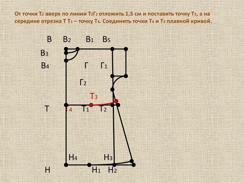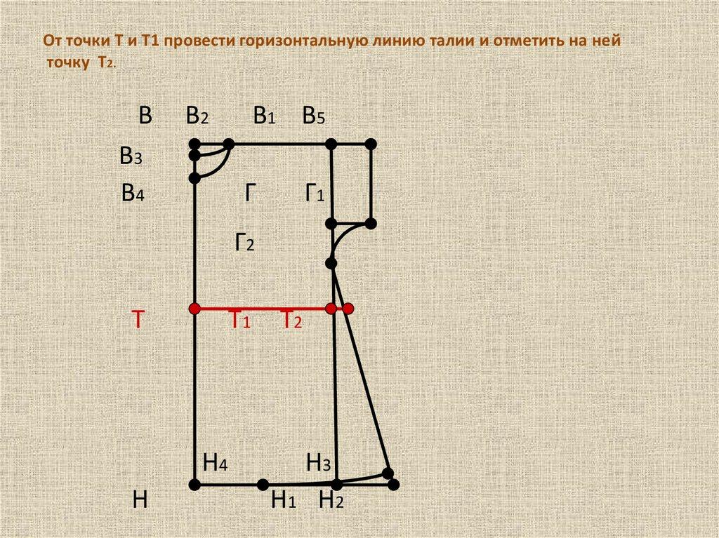 От точки Т и Т1 провести горизонтальную линию талии и отметить на нейточку Т2.