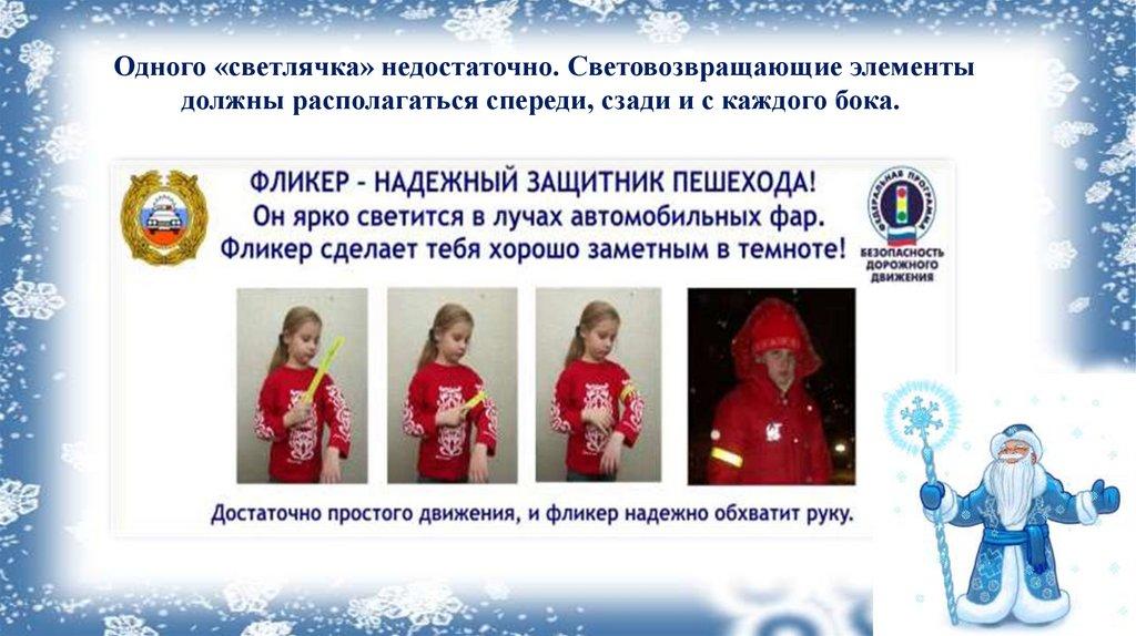 Одного «светлячка» недостаточно. Световозвращающие элементыдолжны располагаться спереди, сзади и с каждого бока.