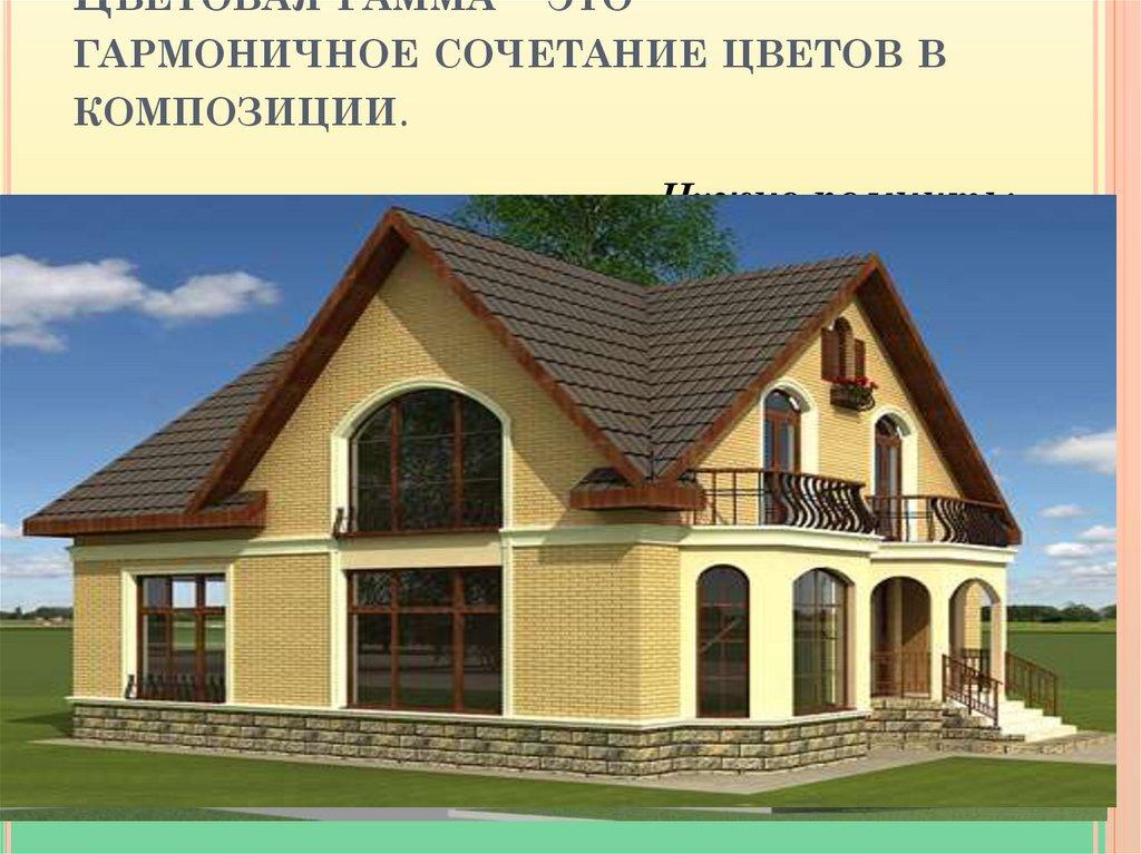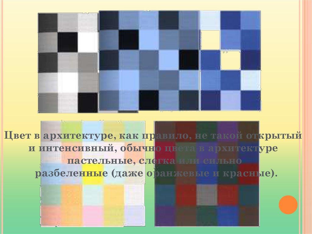 Цвет в архитектуре, как правило, не такой открытыйи интенсивный, обычно цвета в архитектуре