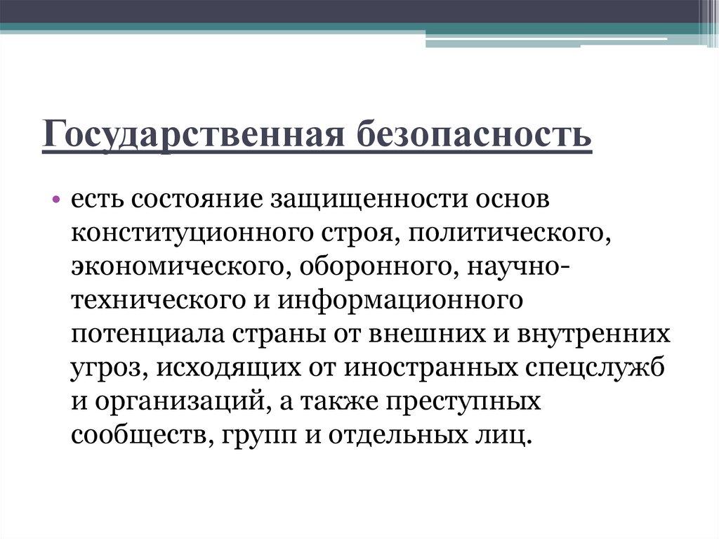 Государственная безопасность• есть состояние защищенности основ