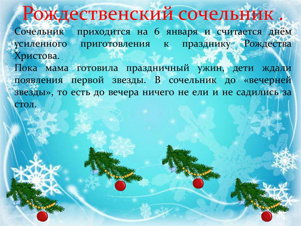 Рождественский сочельник .Сочельник приходится на 6 января и считается днём