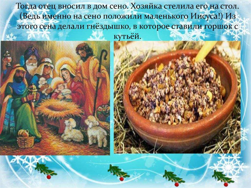 Тогда отец вносил в дом сено. Хозяйка стелила его на стол.(Ведь именно на сено положили маленького Иисуса!) Из