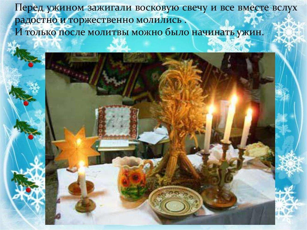 Перед ужином зажигали восковую свечу и все вместе вслухрадостно и торжественно молились .