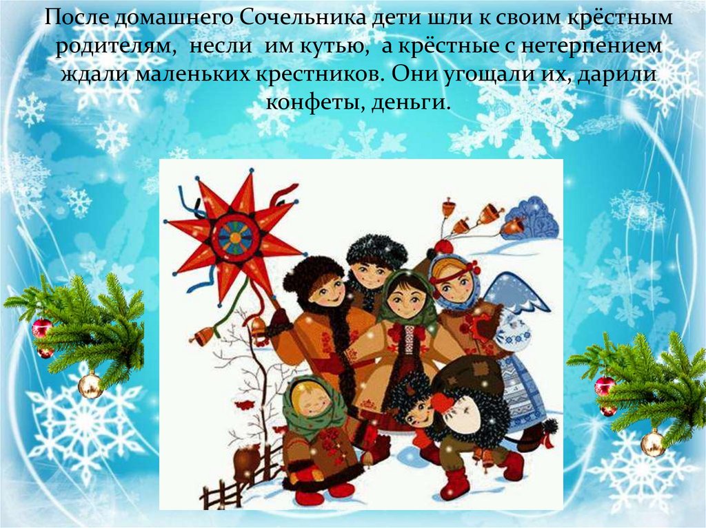 После домашнего Сочельника дети шли к своим крёстнымродителям, несли им кутью, а крёстные с нетерпением