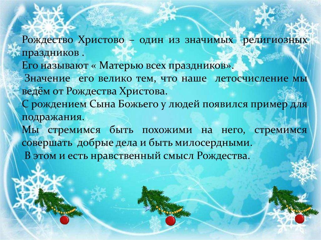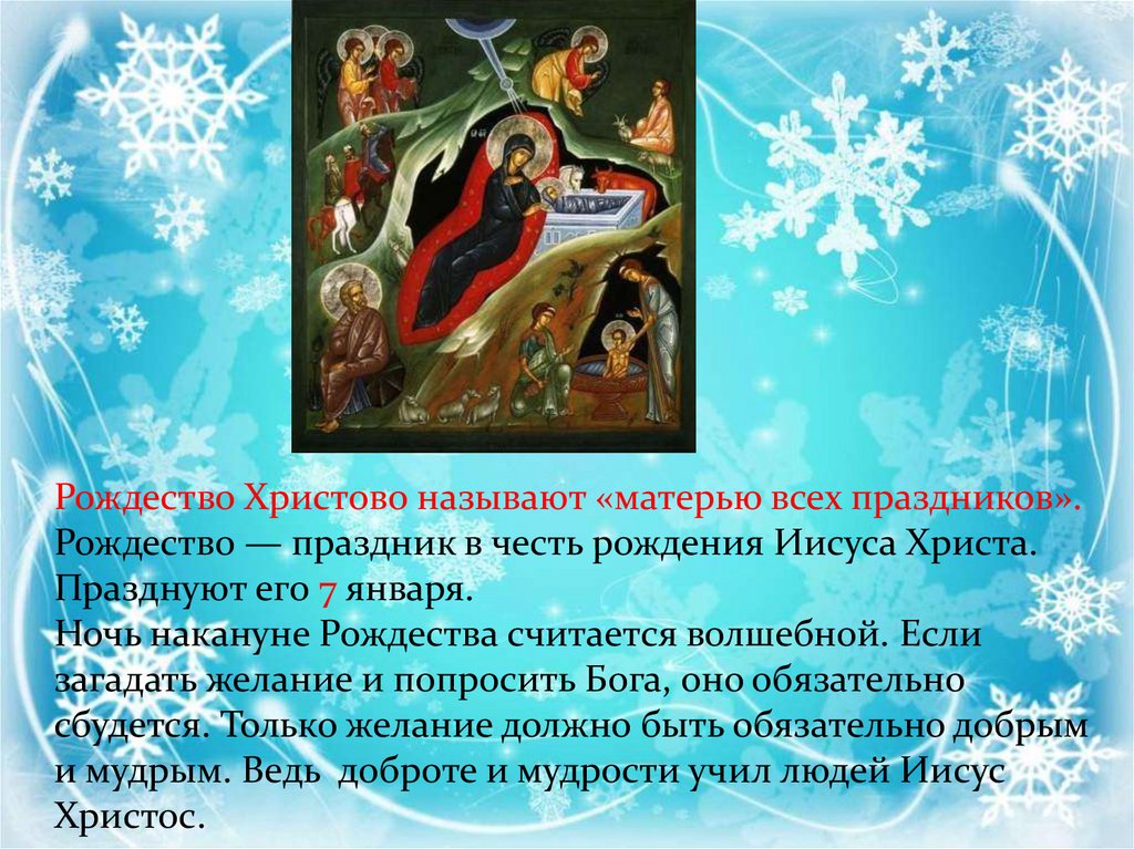 Рождество Христово называют «матерью всех праздников».Рождество — праздник в честь рождения Иисуса Христа.