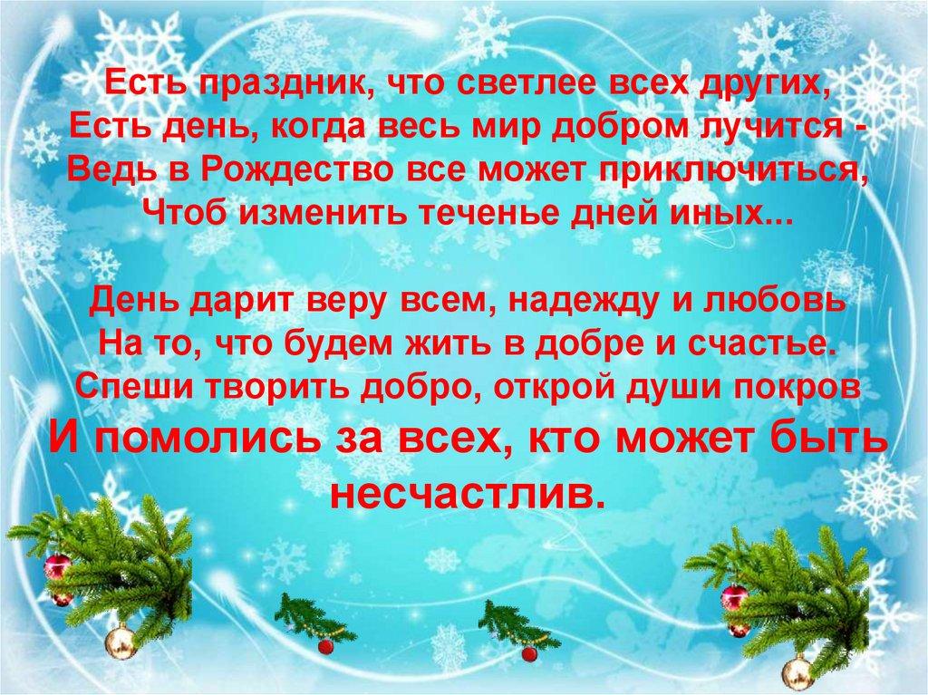 Есть праздник, что светлее всех других,Есть день, когда весь мир добром лучится Ведь в Рождество все может приключиться,