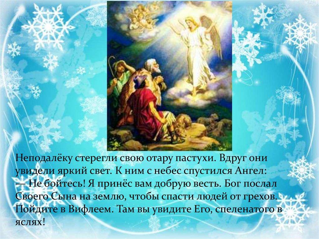 Неподалёку стерегли свою отару пастухи. Вдруг ониувидели яркий свет. К ним с небес спустился Ангел: