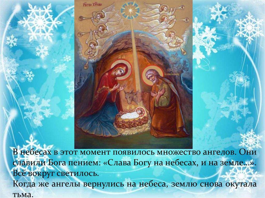 В небесах в этот момент появилось множество ангелов. Ониславили Бога пением: «Слава Богу на небесах, и на земле…».