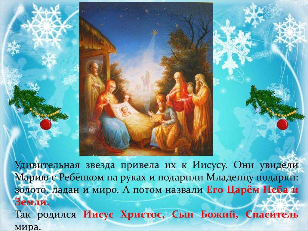 Удивительная звезда привела их к Иисусу. Они увиделиМарию с Ребёнком на руках и подарили Младенцу подарки: