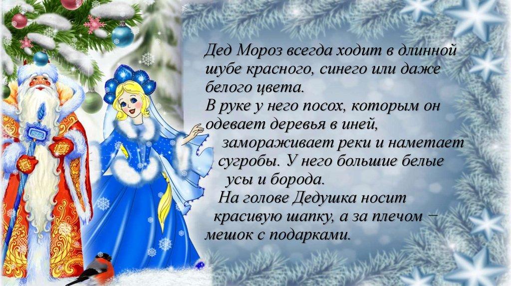 Дед Мороз всегда ходит в длиннойшубе красного, синего или даже