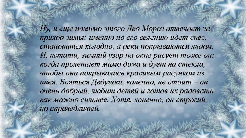 Ну, и еще помимо этого Дед Мороз отвечает заприход зимы: именно по его велению идет снег,