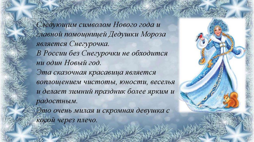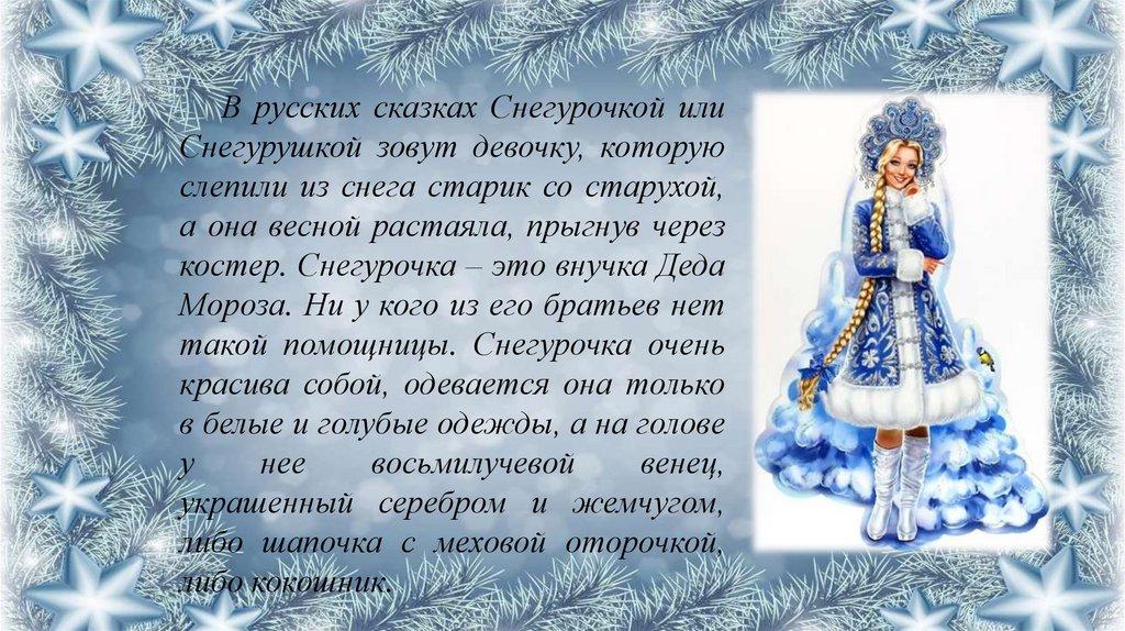 В русских сказках Снегурочкой илиСнегурушкой зовут девочку, которую
