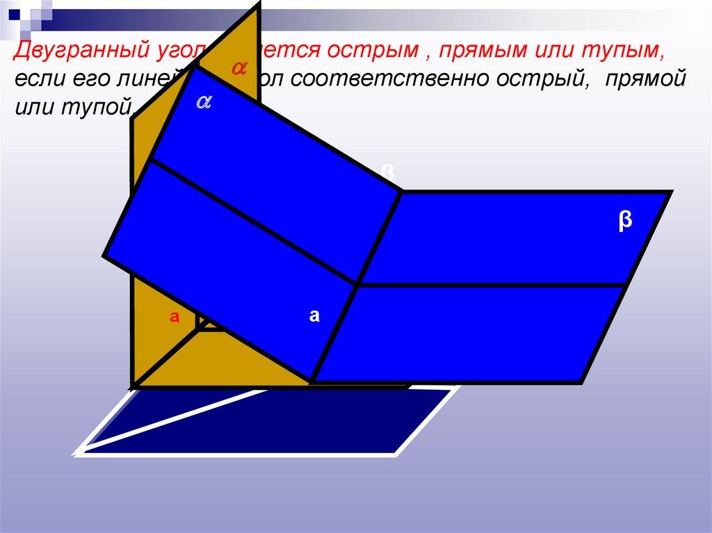 Двугранный угол является острым , прямым или тупым,если его линейный угол соответственно острый, прямой