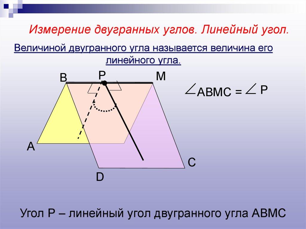Измерение двугранных углов. Линейный угол.Величиной двугранного угла называется величина его