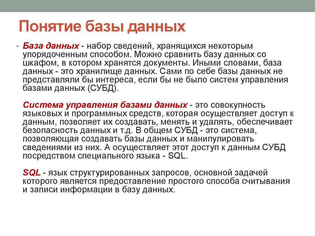 Понятие базы данных• База данных - набор сведений, хранящихся некоторым