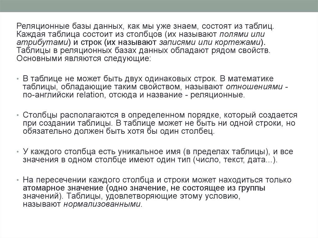 Реляционные базы данных, как мы уже знаем, состоят из таблиц.Каждая таблица состоит из столбцов (их называют полями или