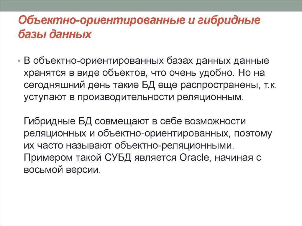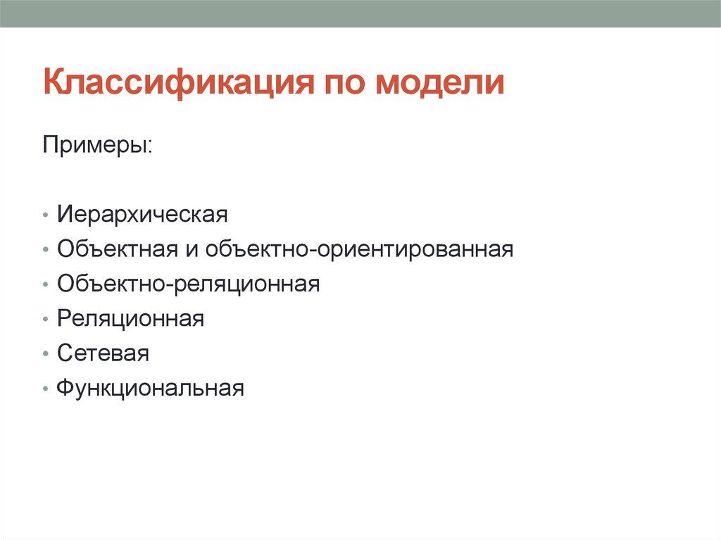 иерархическую, сетевую, реляционную, объектноориентированную и гибридную модели баз данных.