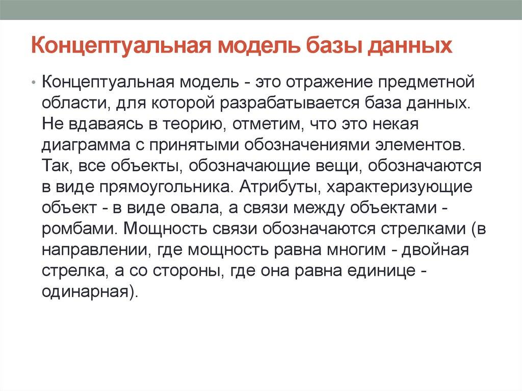 Концептуальная модель базы данных• Концептуальная модель - это отражение предметной