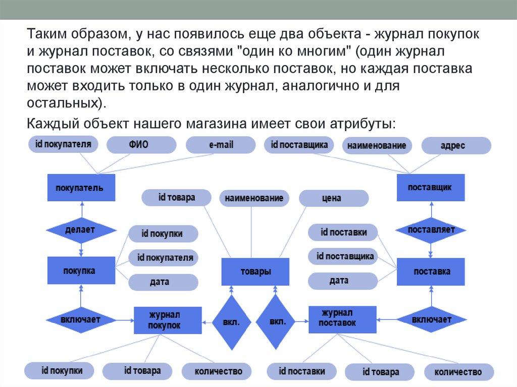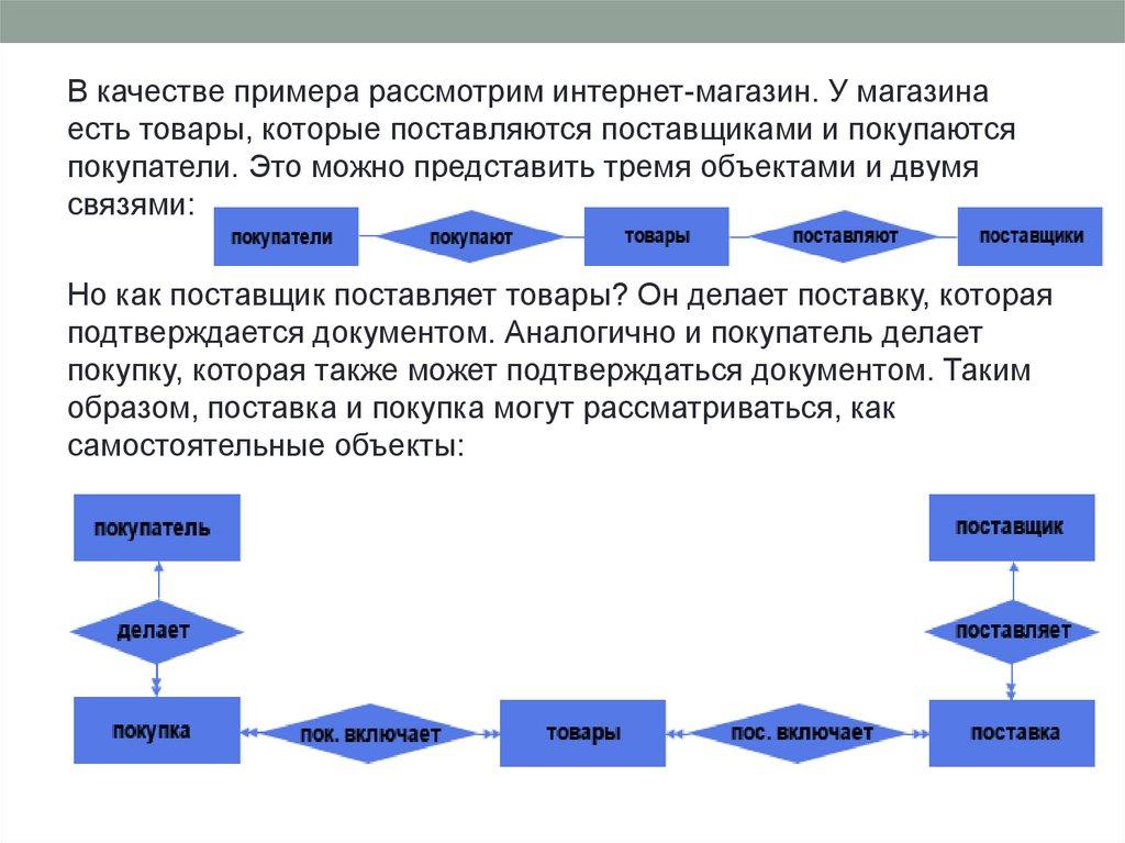 В качестве примера рассмотрим интернет-магазин. У магазинаесть товары, которые поставляются поставщиками и покупаются