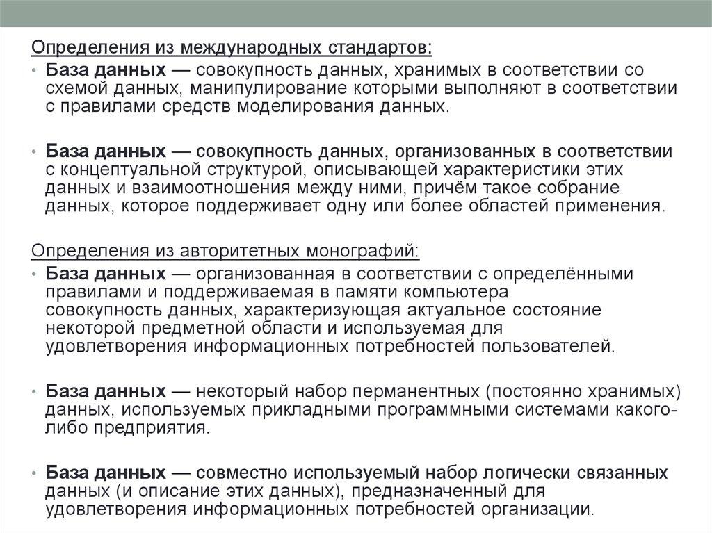 Определения из международных стандартов:• База данных — совокупность данных, хранимых в соответствии со