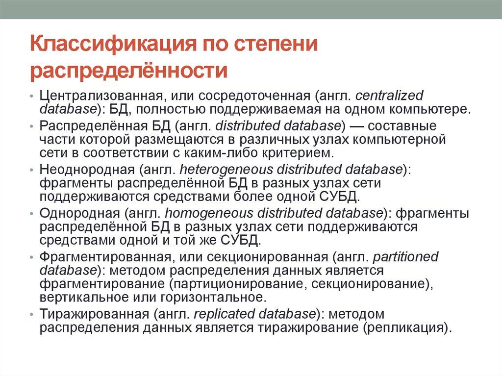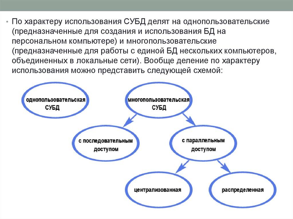 • По характеру использования СУБД делят на однопользовательские(предназначенные для создания и использования БД на