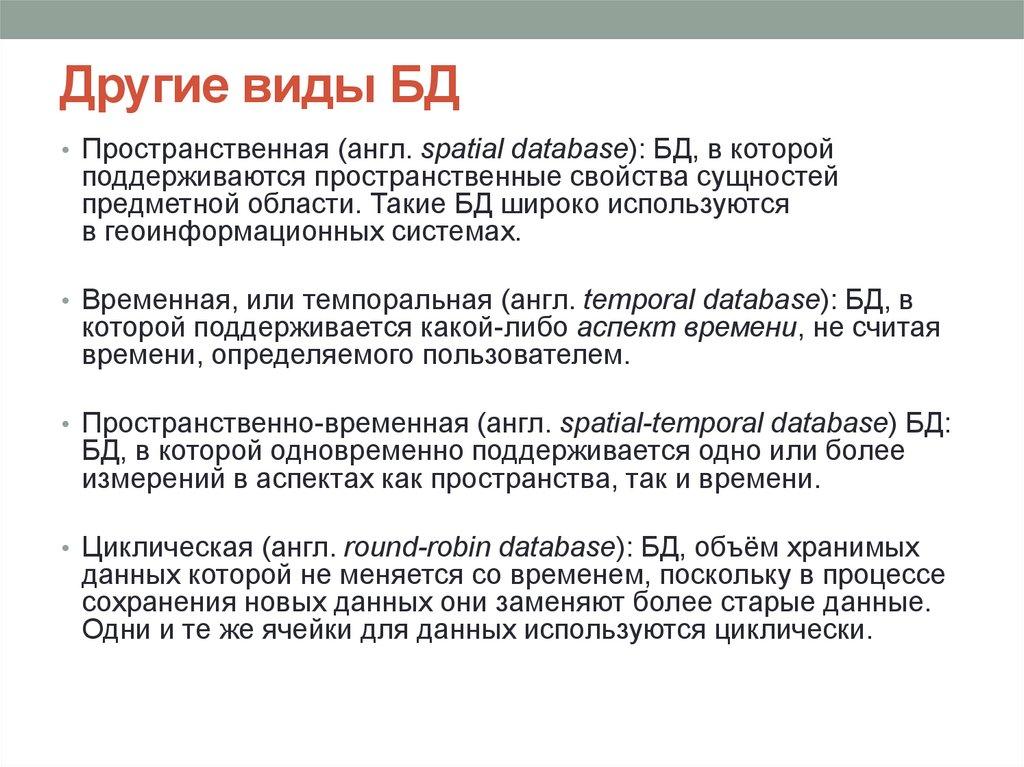 • Пространственно-временная (англ. spatial-temporal database) БД:
