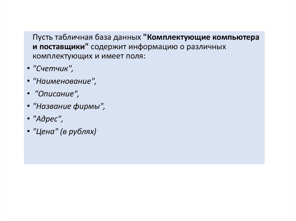 Пусть табличная база данных "Комплектующие компьютераи поставщики" содержит информацию о различных
