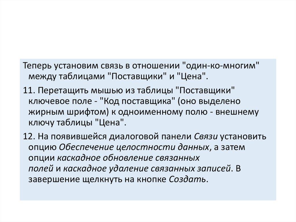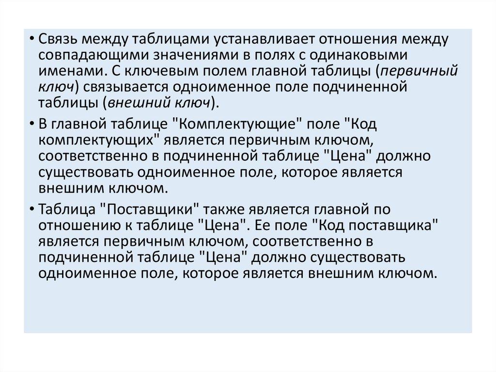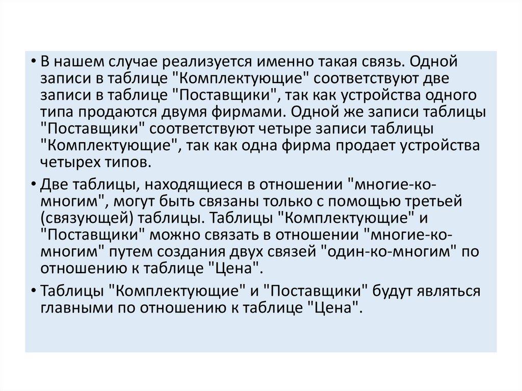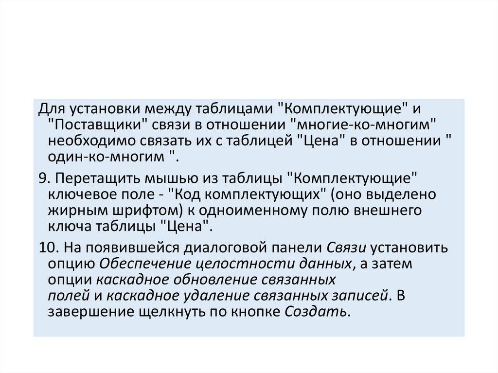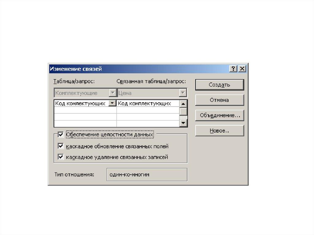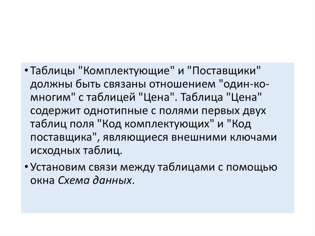 • Таблицы "Комплектующие" и "Поставщики"должны быть связаны отношением "один-комногим" с таблицей "Цена". Таблица "Цена"
