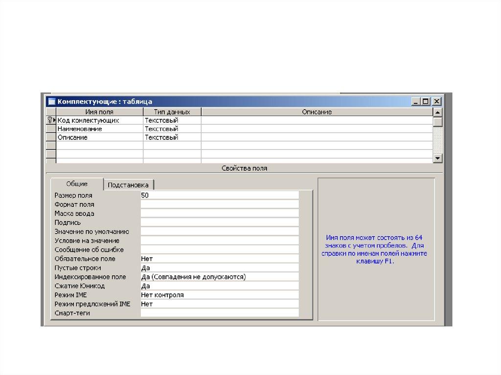 3. В окне Комплектующие: таблица ввести имена полей, тип данных