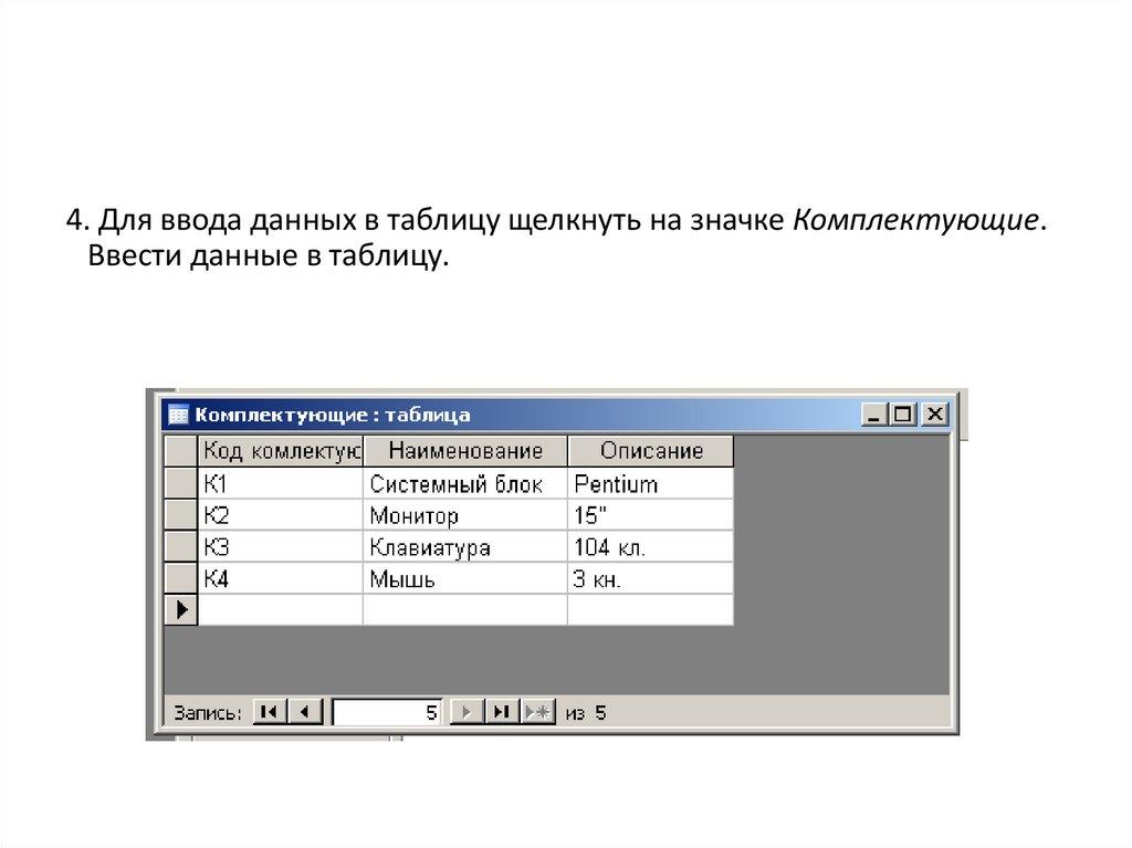 4. Для ввода данных в таблицу щелкнуть на значке Комплектующие.Ввести данные в таблицу.