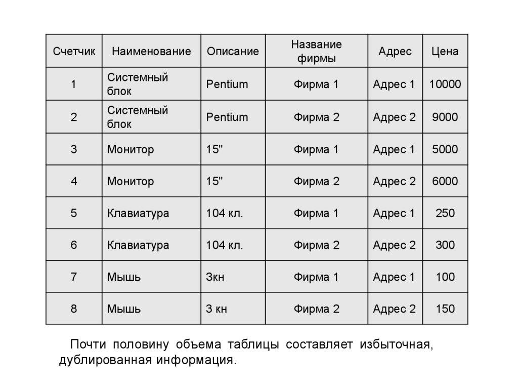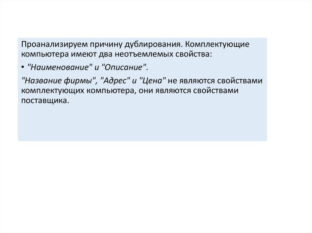 Проанализируем причину дублирования. Комплектующиекомпьютера имеют два неотъемлемых свойства: