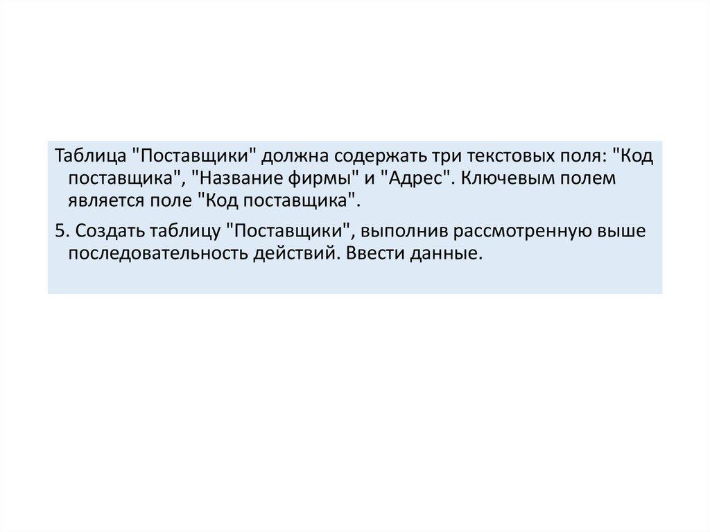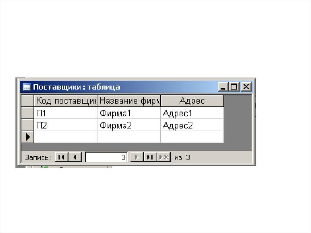 Таблица "Поставщики" должна содержать три текстовых поля: "Кодпоставщика", "Название фирмы" и "Адрес". Ключевым полем