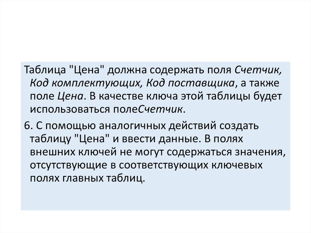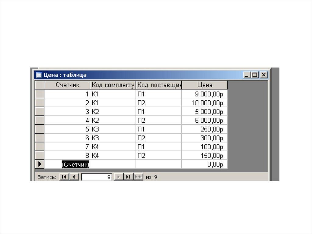 Таблица "Цена" должна содержать поля Счетчик,Код комплектующих, Код поставщика, а также