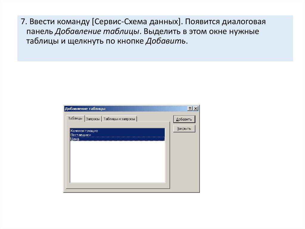 7. Ввести команду [Сервис-Схема данных]. Появится диалоговаяпанель Добавление таблицы. Выделить в этом окне нужные