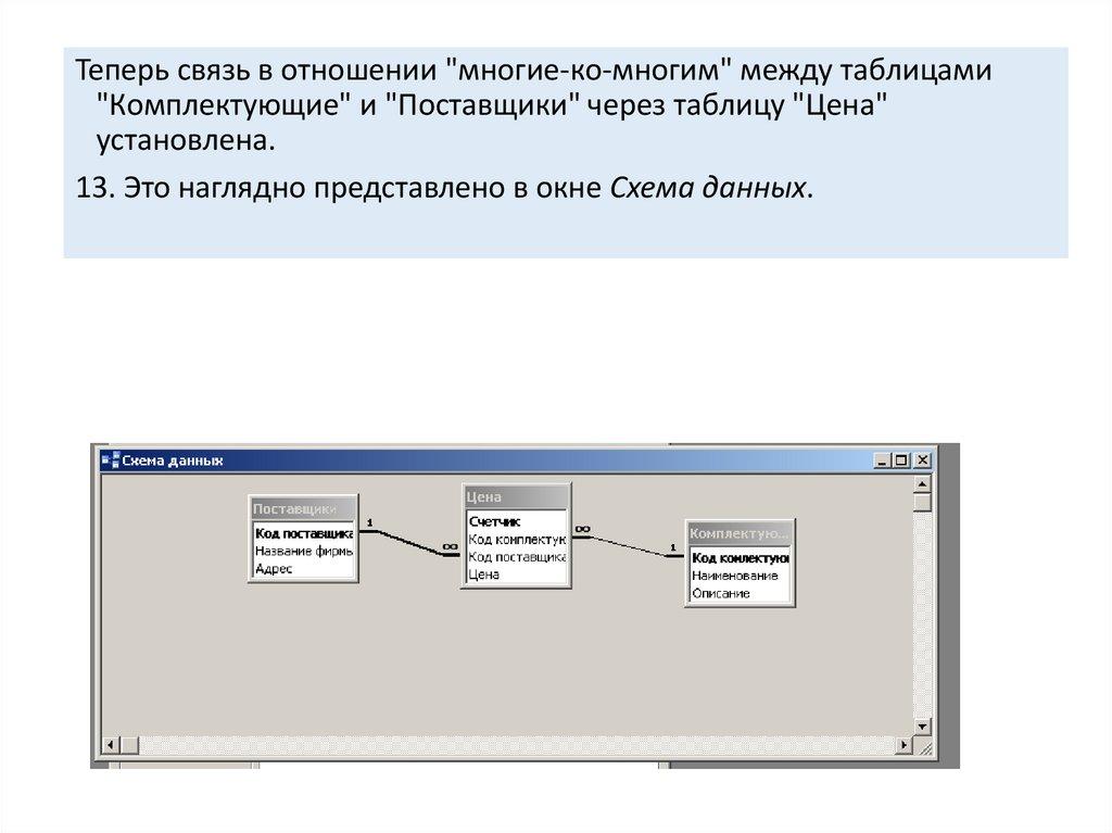 Теперь связь в отношении "многие-ко-многим" между таблицами"Комплектующие" и "Поставщики" через таблицу "Цена"
