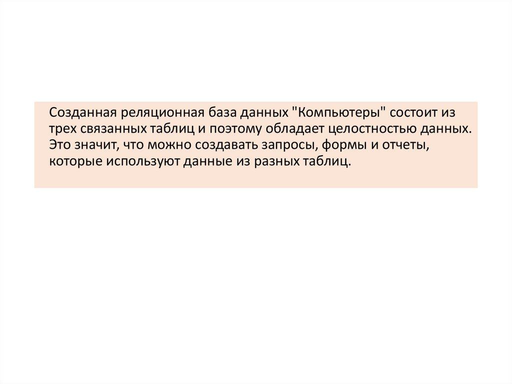 Созданная реляционная база данных "Компьютеры" состоит изтрех связанных таблиц и поэтому обладает целостностью данных.