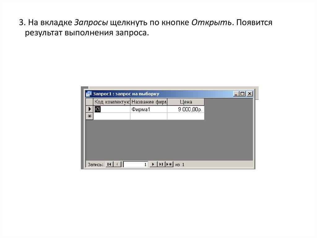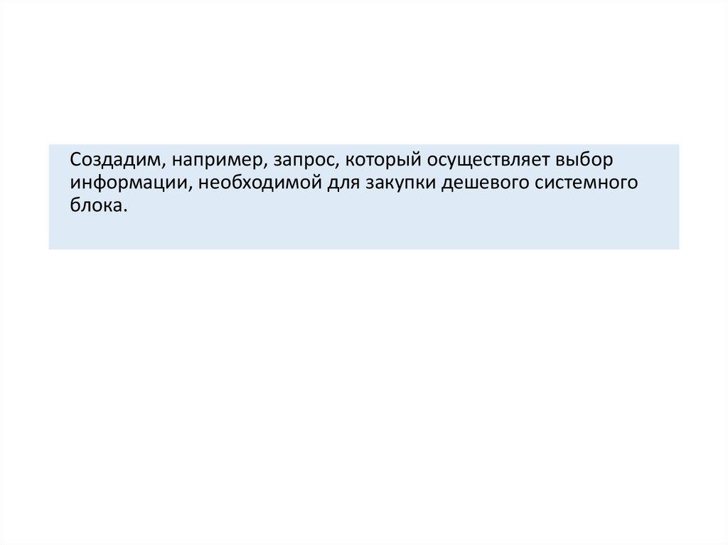 Создадим, например, запрос, который осуществляет выборинформации, необходимой для закупки дешевого системного